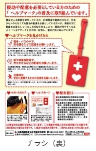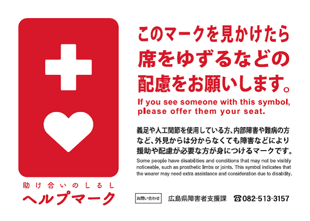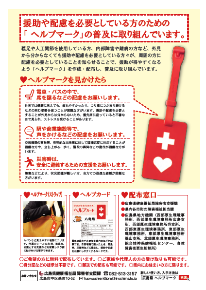 義足や人工関節を使用している方、内部障害や難病の方など、配慮や援助を必要としていることが外見からは分からない方が、周囲に配慮を必要としていることを知らせることにより、援助が得やすくなるマークとして、東京都が作成した「ヘルプマーク」の普及促進に取り組んでいます。