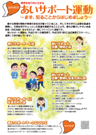 チラシの表面はあいサポーター、あいサポート企業・団体についての内容をまとめています。裏面はあいサポート研修に参加された受講者の皆さんの声を掲載しています。チラシを自社の社員の皆さんや地域の皆さんに配布していただき、あいサポート運動の普及にご活用ください。