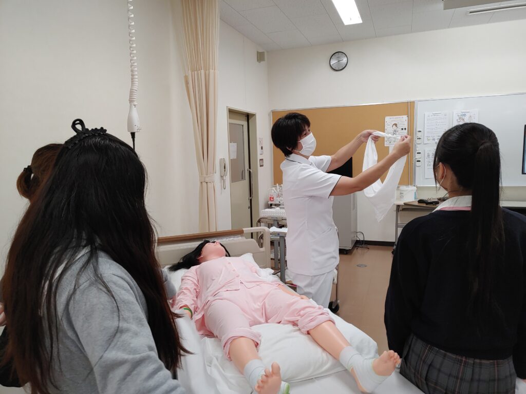 看護学科のオープンキャンパスでは、「防災への備えファーストエイド(創の保護や固定をしよう)~巻軸包帯・三角巾による包帯法など」のテーマで開催されました。