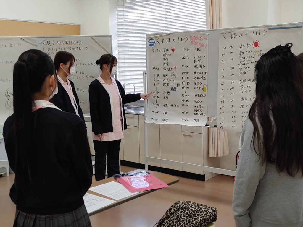 看護学科説明では、1年生の学生を中心に学校の生活や行事について説明を行いました。1年生のリアルな平日・休日の過ごし方を模造紙に書いて紹介しました。具体的にどう過ごしているか学校での過ごし方は興味を持って見られていました。ストレス解消の仕方や余暇の楽しみ方では笑い声があり、髪の毛の色や実習先など具体的な質問もありました。「優しかった。おもしろかった。」などの感想がありました。次回オープンキャンパス 11月16日(日)テーマは、「体温を探る 血圧、脈、心臓の音を聞いてみよう~バイタルサイン測定体験」です。